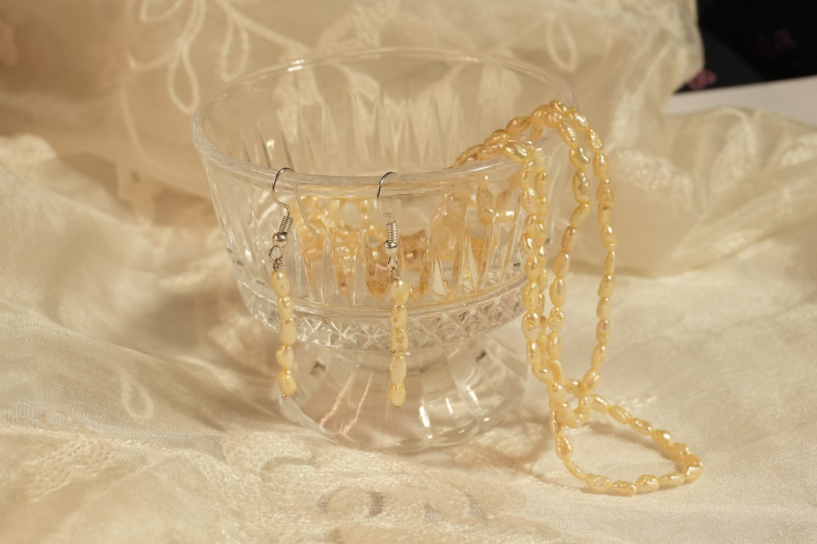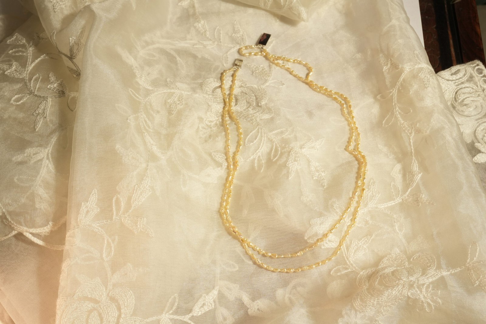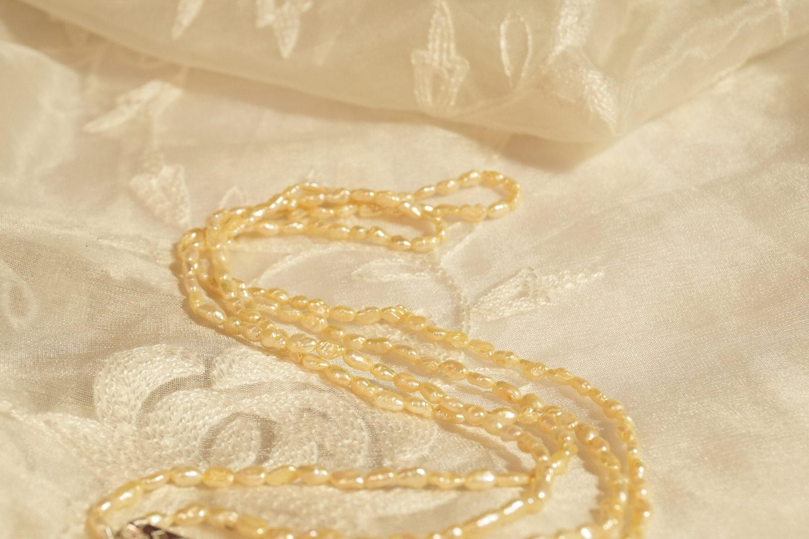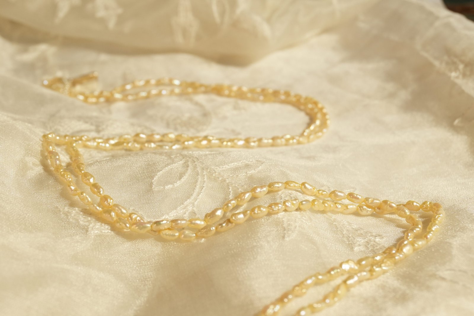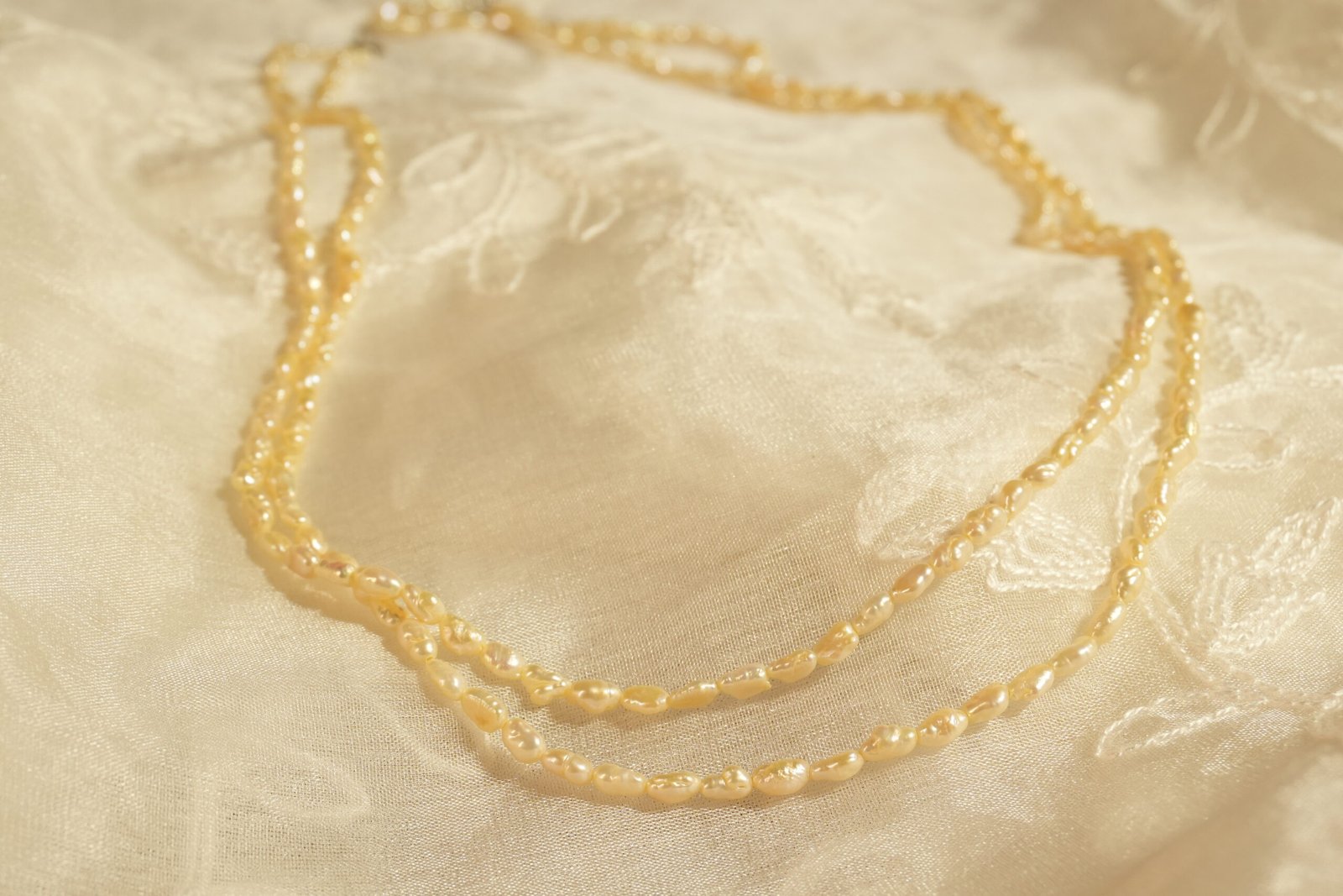 Distinctive and organically elegant, this 2-line necklace features uneven-shaped pearls in a soft light golden hue. The natural, irregular forms lend character and individuality, while the warm golden tone enhances its refined charm.