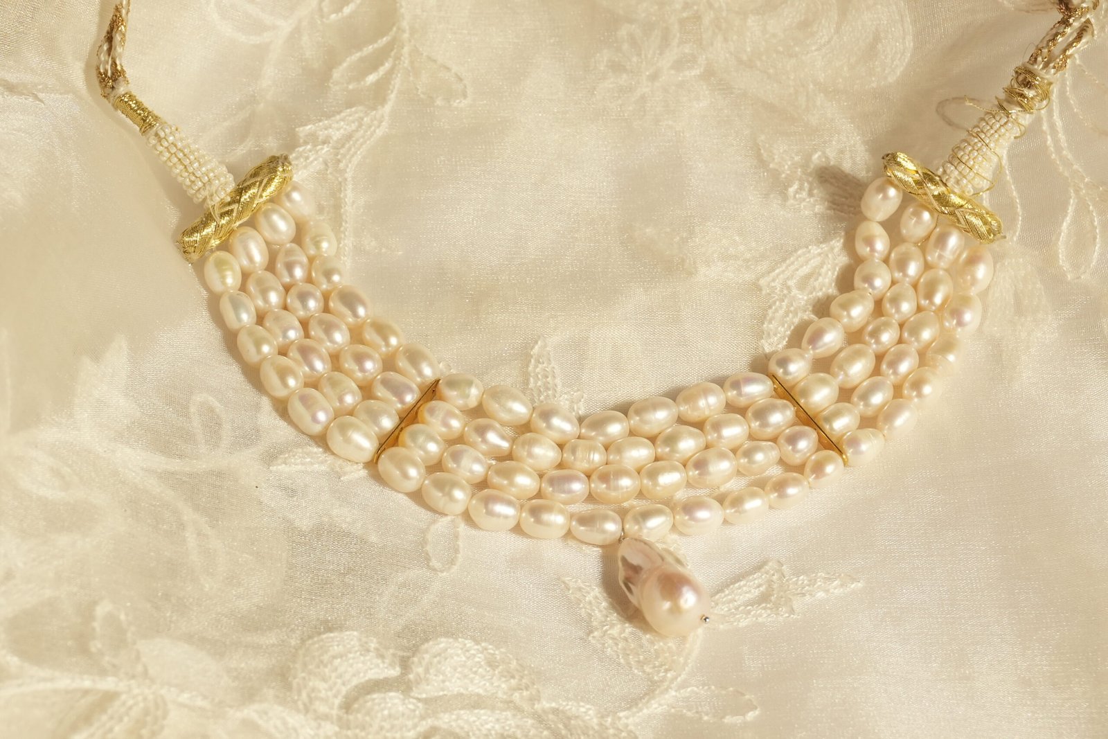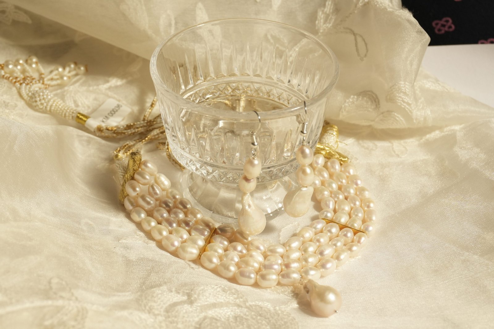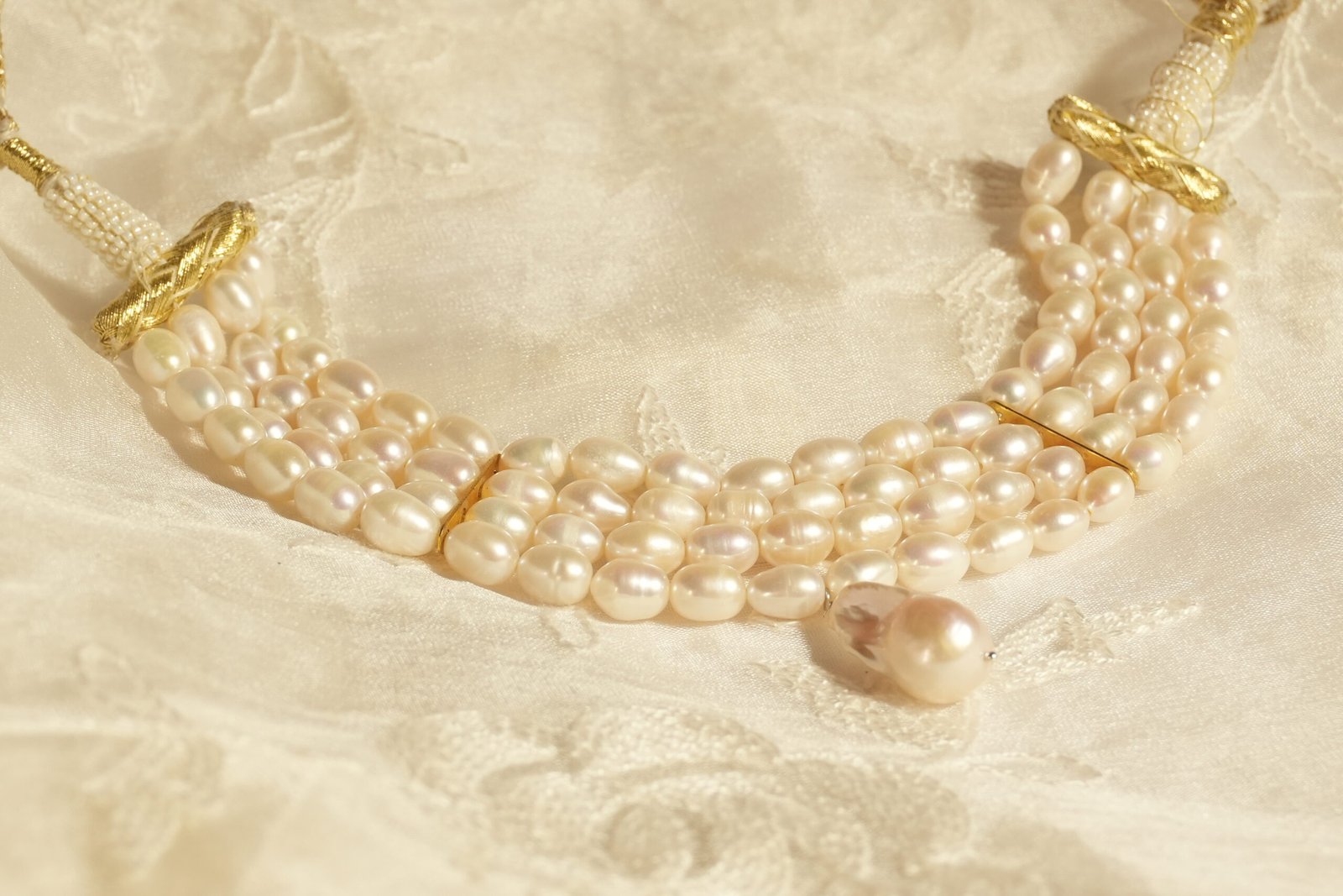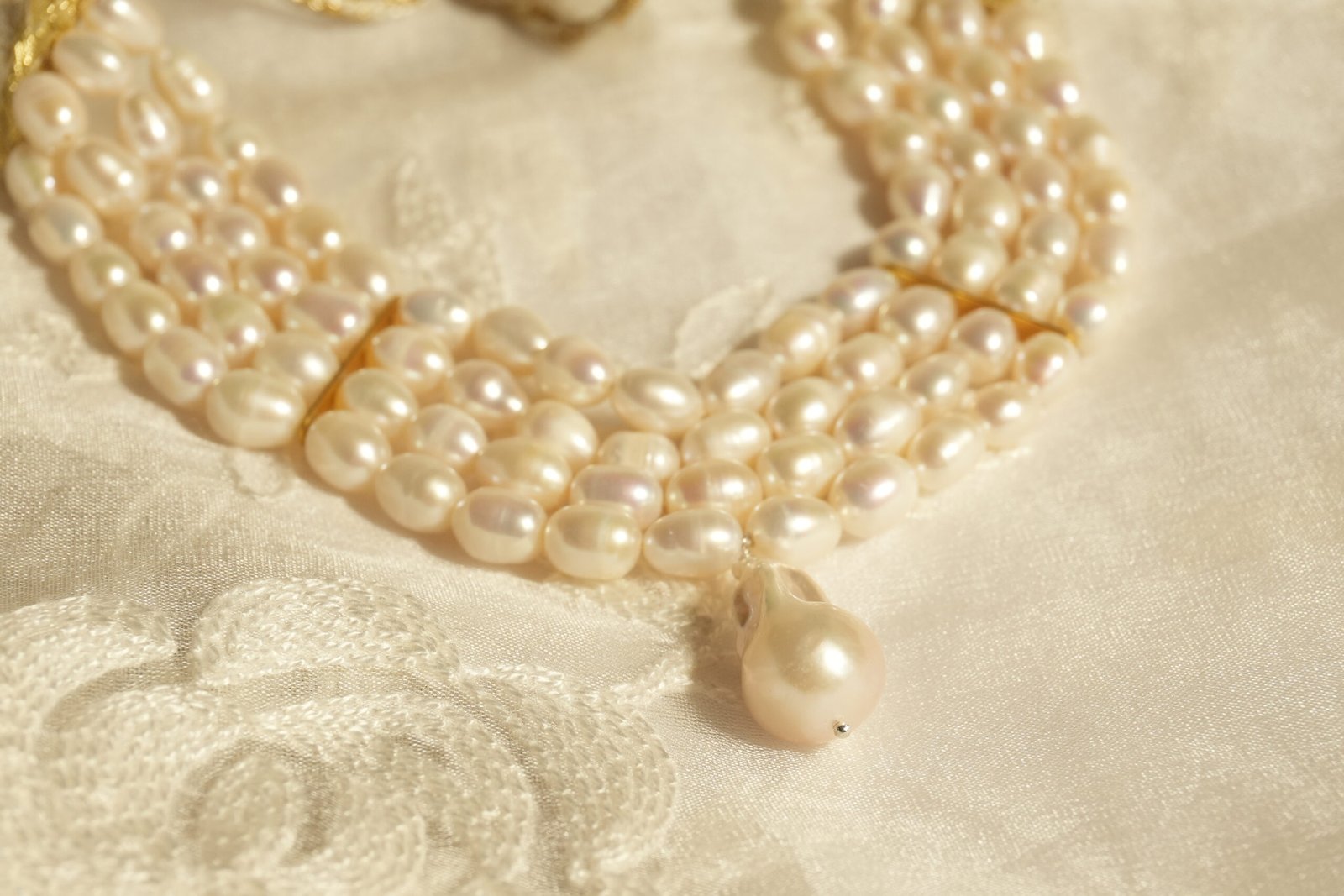 Elegant and luminous, this multi-strand freshwater pearl necklace showcases soft white pearls with delicate hints of pink undertones. The layered design creates a rich, voluminous look, while the natural baroque shapes add character and individuality to each strand.