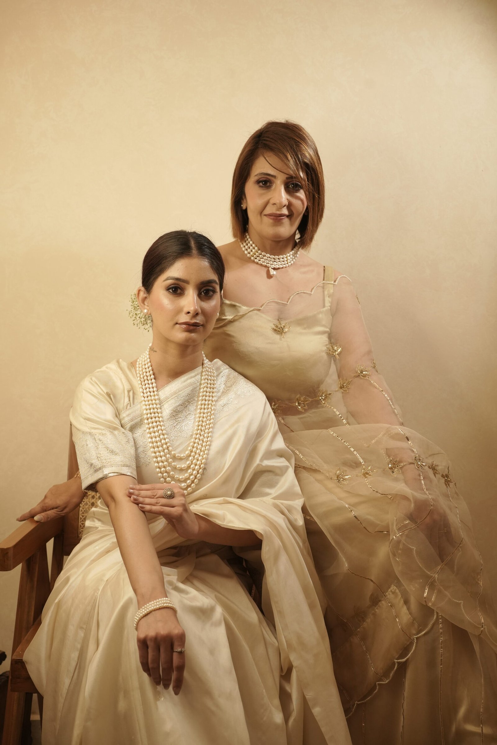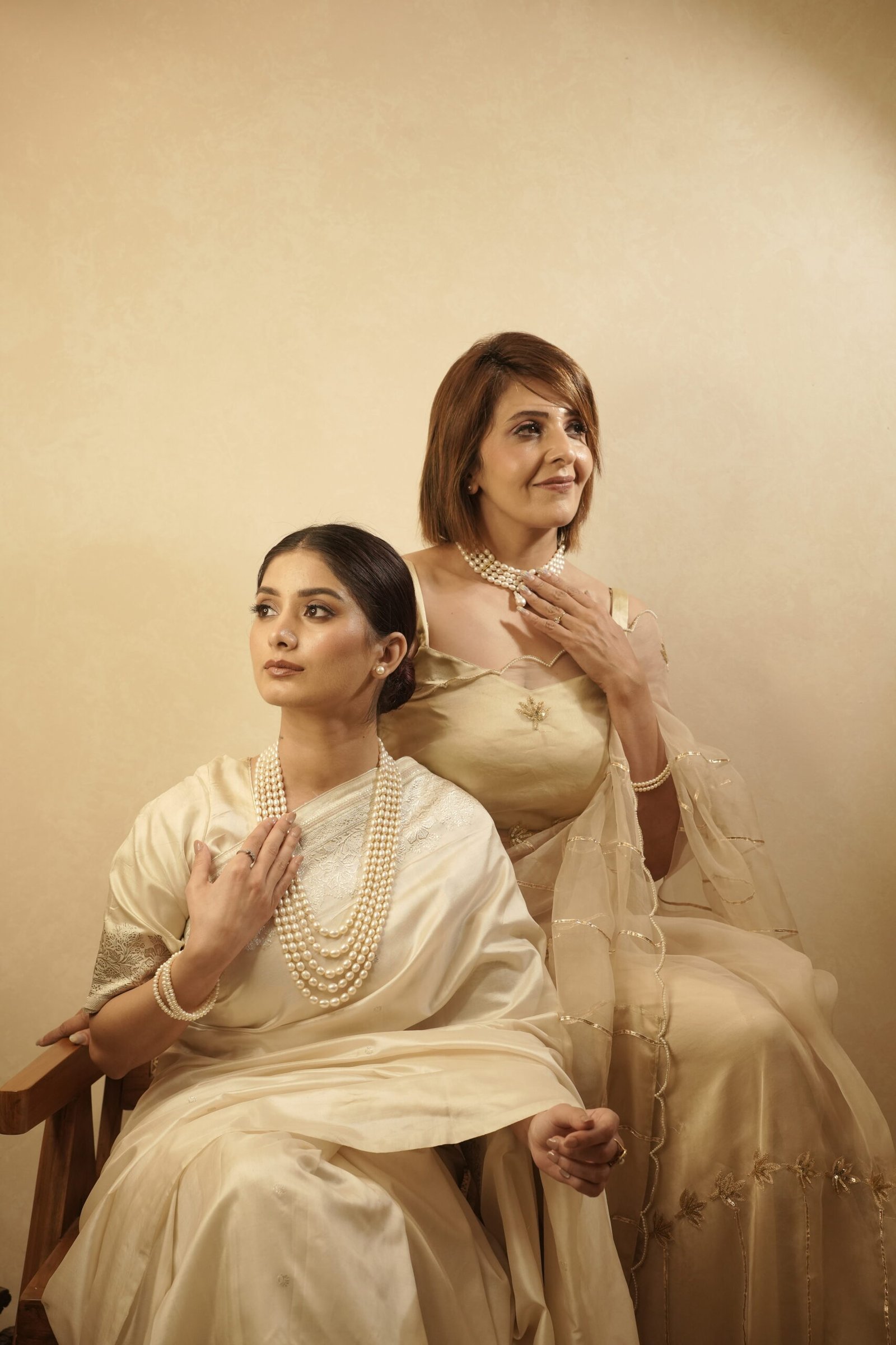 Accentuated with refined gold-toned elements and a statement pearl drop, the piece exudes a luxurious yet graceful appeal. The gentle blush reflections enhance its femininity, making it perfect for both festive occasions and sophisticated evening wear.