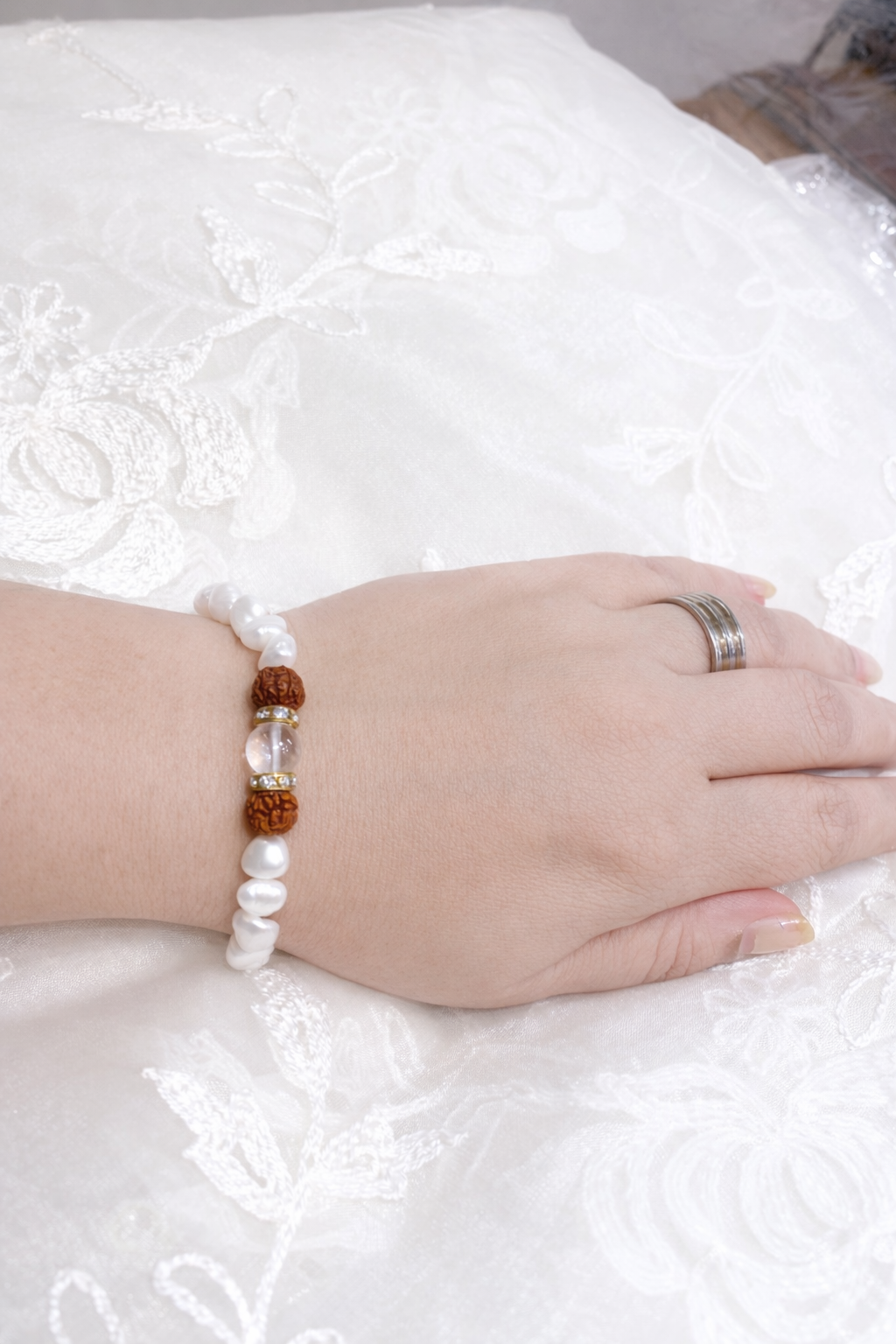 Delicate yet distinctive, this Rudraksha Pearl Bracelet is designed with elegance and intention. A strand of luminous pearls forms the foundation, beautifully complemented by two authentic Rudraksha beads that add spiritual depth and symbolism.